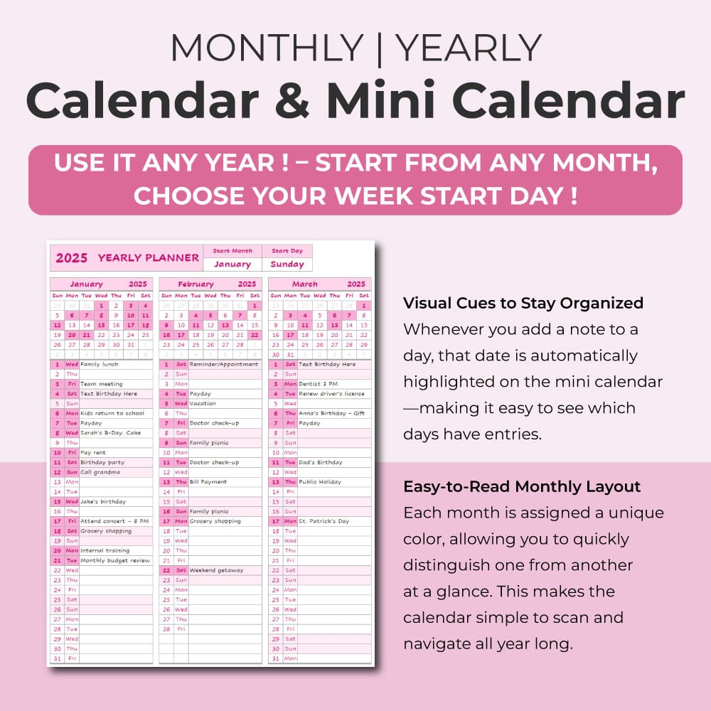 Stay organized all year long with this clean, color-coded One-Page Monthly Planner – a fully editable annual calendar spreadsheet for Excel and Google Sheets. This smart layout gives you a clear full year view of your calendar events, appointments, birthdays, and to-do notes — all in one place.
