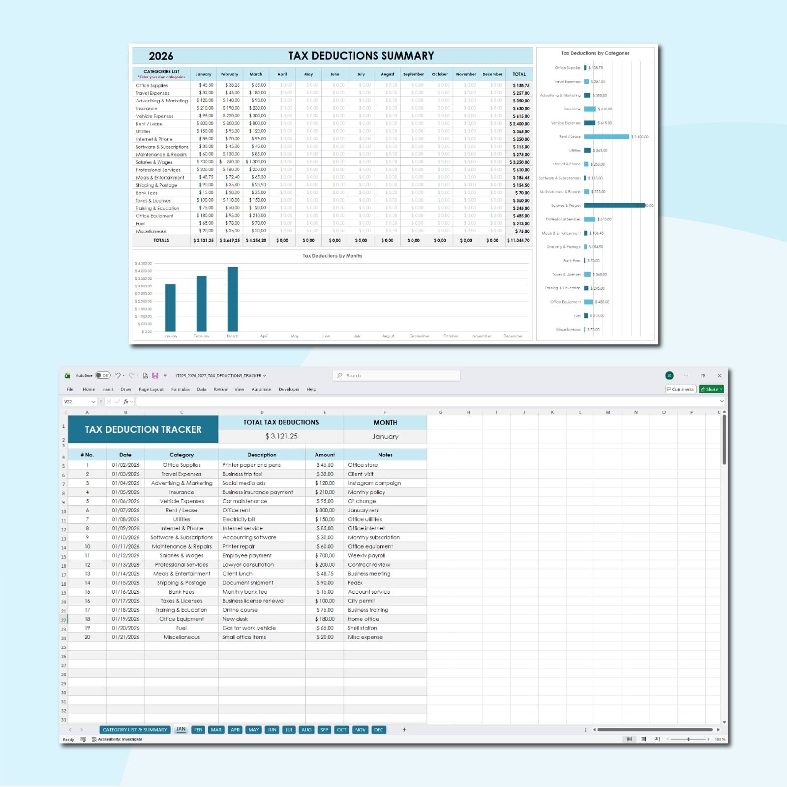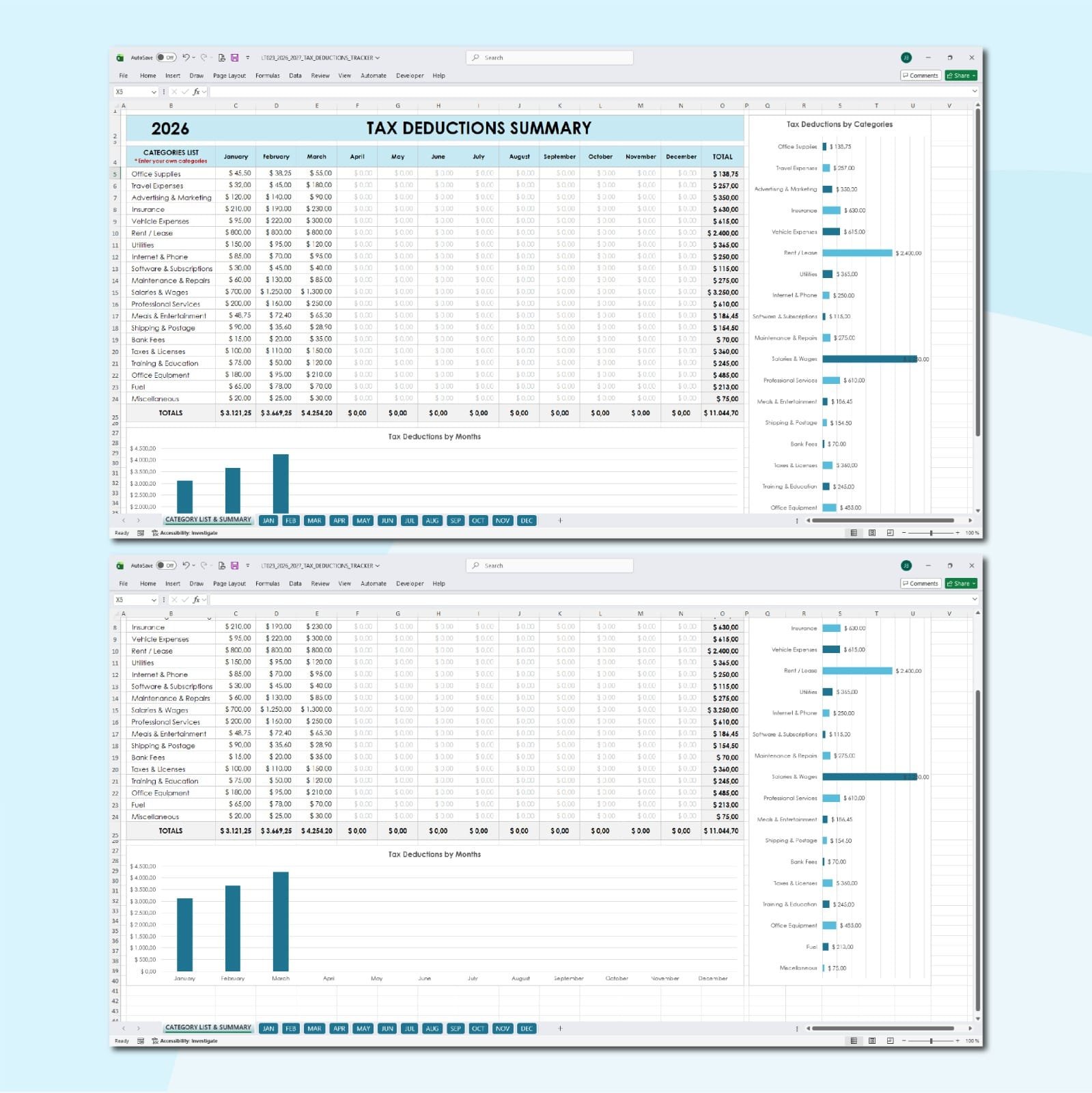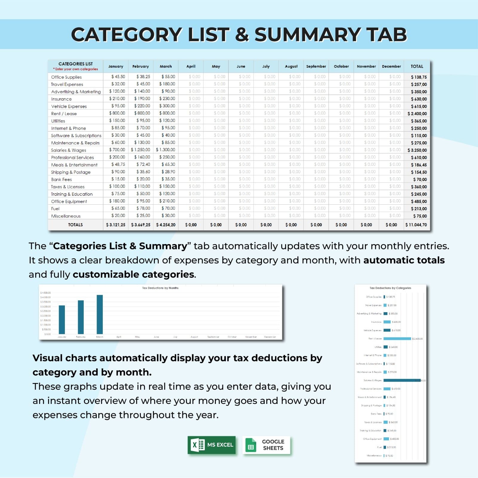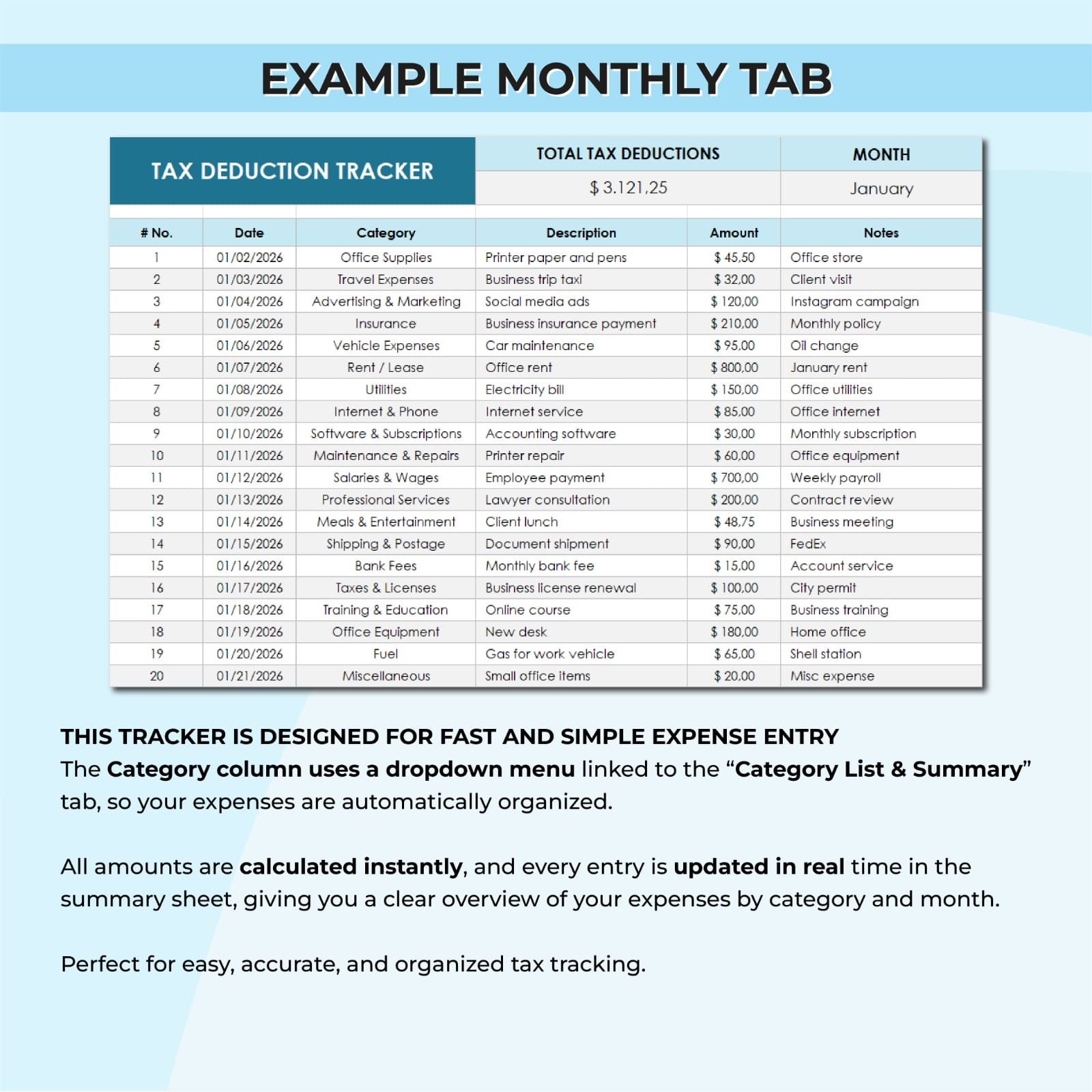 ✅ Automated Totals: Formulas that instantly calculate your total deductions by category.
